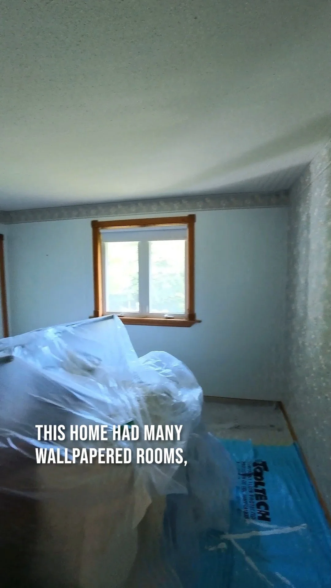 Room under renovation with furniture covered in plastic and walls partially painted.